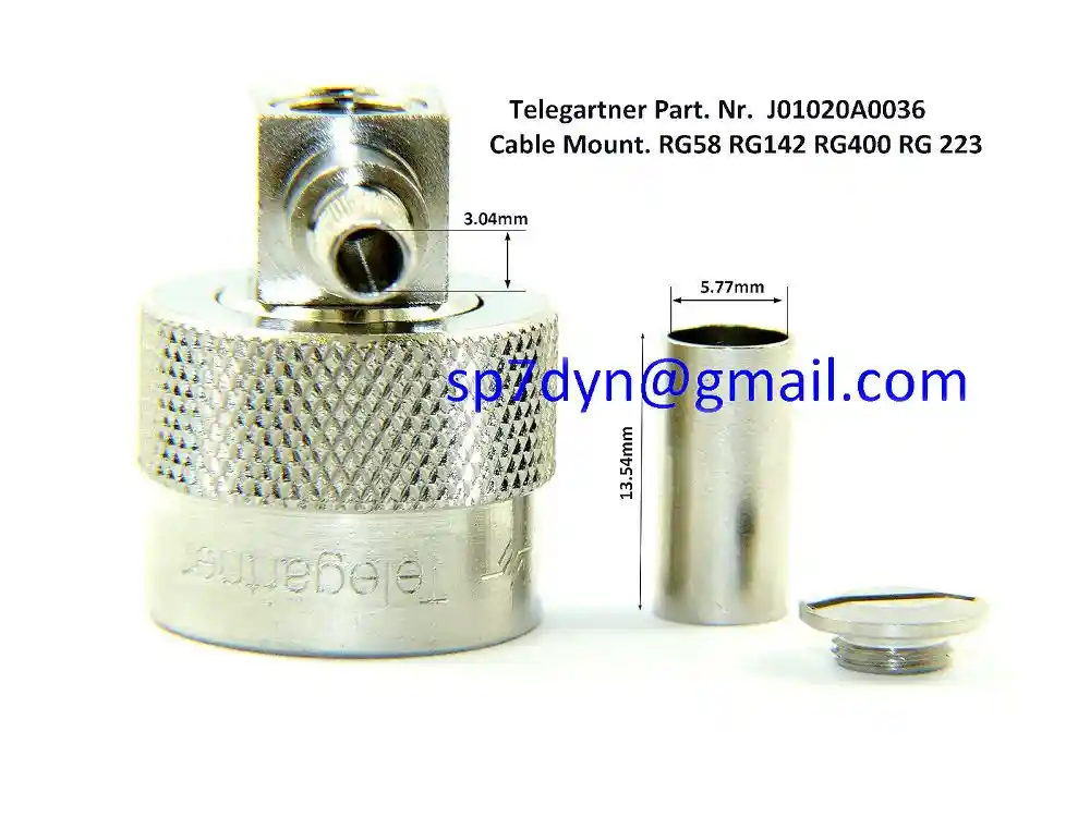 Specification: Art. Nr. ------------- J01020A0036 Impedance ------------ 50 Ohm Frequency ------------ DC-11GHz For cable type ------- RG58 RG142 RG223 RG400 & others Assembly ------------- B1805 Gasket --------------- Silikon Contact Material ----- Beryllium Copper Bronze Insulator ------------ PTFE Teflon - Price is for -------- 1 pc