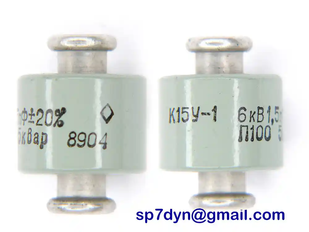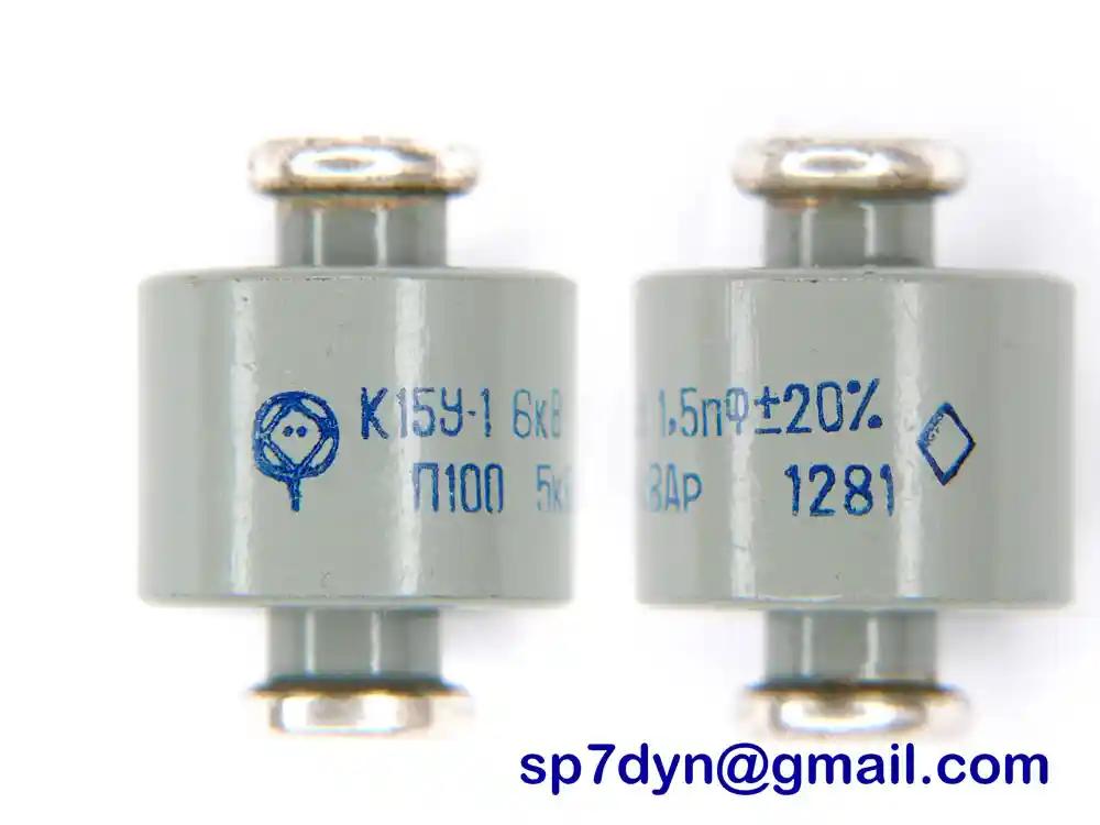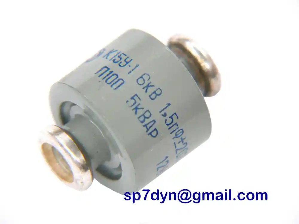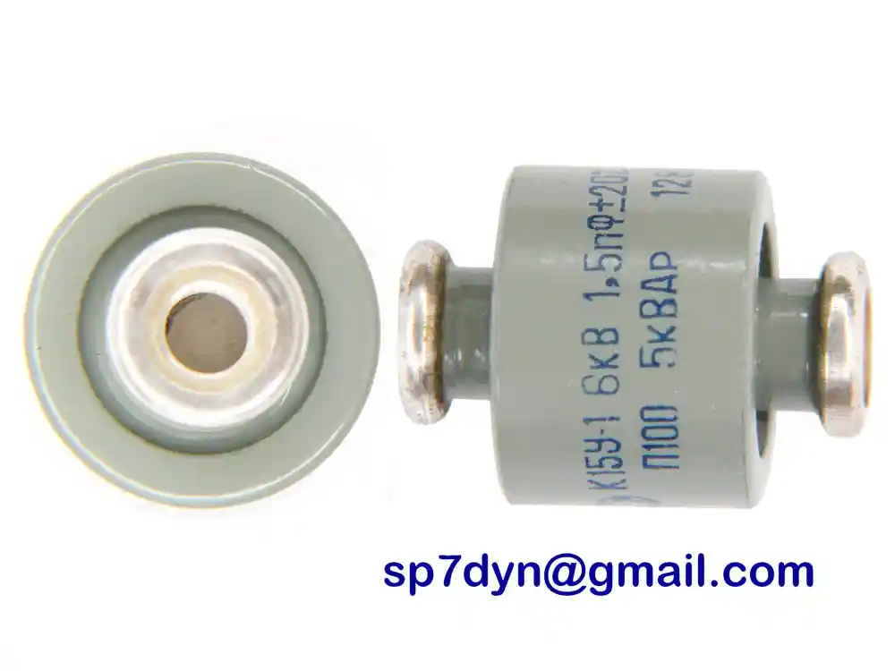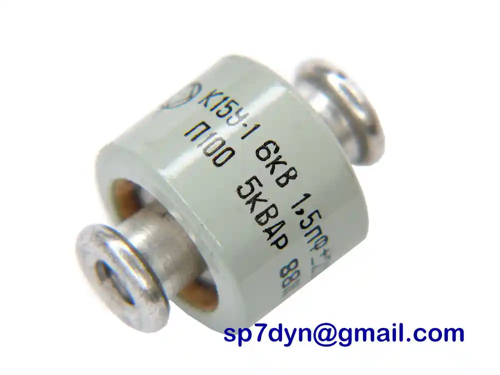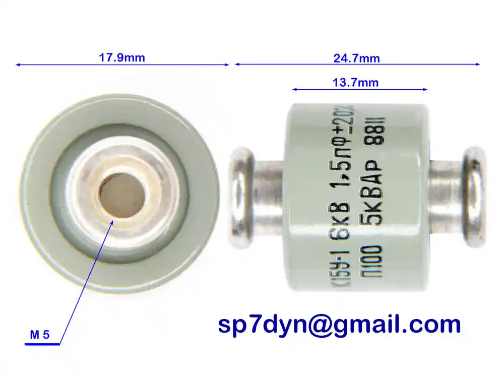 Specifications: Manufacture -------------- Military Russian Army Model -------------------- K15Y-1 Type --------------------- Ceramic Doorknob Capacitor Capacity ----------------- 1.5pF Operating voltage -------- 6KV Rated Power -------------- 5 KWAr Screw Size --------------- M5 Typical Condition ---------------- Brand New (NOS) Price is for ------------- 1 piece
