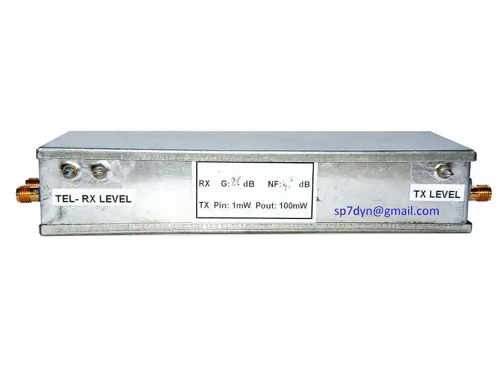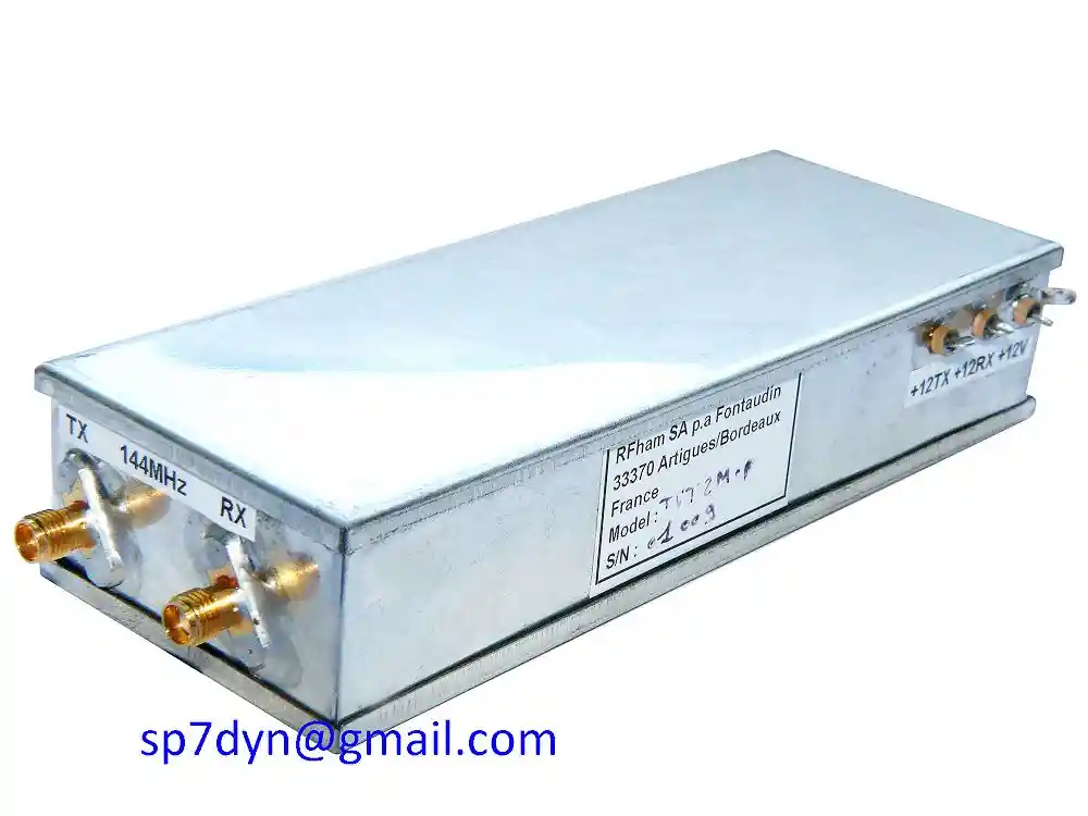 Specifications: Brand ---------- F5FLN, F4ARY, F4ARU RFHam SA p.a Fontaudin 33370 Artigues/Bordeaux Model ---------- TVT 2M - 1 Frequency ------ 144MHz to 28MHz RX Gain -------- 20dB NF ------------- 1.2dB TX IN ---------- 1mW P OUT ---------- 100mW Power Supply --- 12VDC S/N ------------ 1009 - Price is for 1 piece